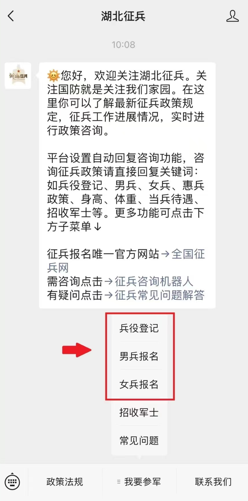 關(guān)注“湖北征兵”公眾號,點(diǎn)擊菜單欄“我要參軍”,直通報(bào)名頁面。
