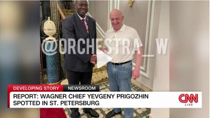 社交媒體上的照片顯示,普里戈任身著白色T恤和休閑牛仔褲,神情愉悅,與一名身著西裝的非洲代表熱情握手,有觀察組織指出,這名非洲官員可能是中非共和國(guó)的官員。另一張照片中,他則穿著相同的服裝,和一名身著休閑裝的非洲代表握手。