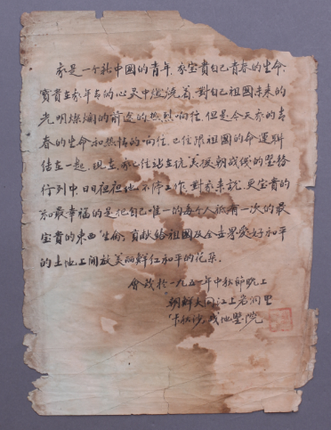 1951年抗美援朝志愿軍戰(zhàn)士在朝鮮前線寫下的帶血請(qǐng)戰(zhàn)書。