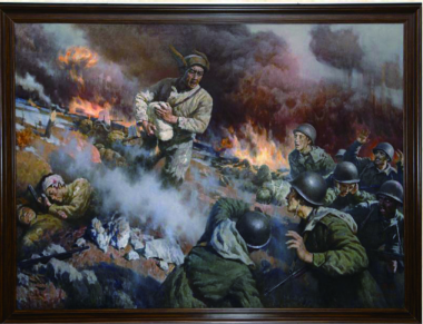 1950年11月29日,志愿軍第20軍58師172團(tuán)3連連長(zhǎng)楊根思,率該連第3排堅(jiān)守位于下碣隅里東南的1071.1高地。美軍以飛機(jī)、火炮對(duì)高地狂轟濫炸,堅(jiān)守陣地的楊根思率領(lǐng)第3排打退數(shù)倍于己的美軍。他是抗美援朝戰(zhàn)爭(zhēng)中第一位特級(jí)戰(zhàn)斗英雄。圖為油畫照片:《楊根思》。