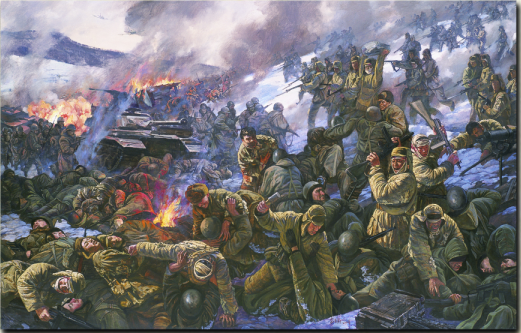 在第二次戰(zhàn)役中,志愿軍第38軍112師335團(tuán)3連在松骨峰與敵遭遇后,在毫無工事依托的高地上,與蜂擁而來的美軍頑強(qiáng)激戰(zhàn)。圖為油畫照片:《激戰(zhàn)松骨峰》。