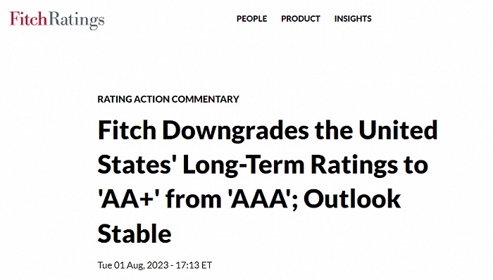 8月1日,惠譽(yù)將美國(guó)長(zhǎng)期外幣發(fā)行人違約評(píng)級(jí)由“AAA”下調(diào)至“AA+”,展望為穩(wěn)定?;葑u(yù)認(rèn)為,美國(guó)評(píng)級(jí)下調(diào)反映了未來三年預(yù)期的財(cái)政惡化,高且不斷增長(zhǎng)的政府債務(wù),以及過去二十年相對(duì)于“AA”和“AAA”評(píng)級(jí)同行的治理侵蝕,這表現(xiàn)在反復(fù)的債務(wù)限額僵局和最后一刻的決議。