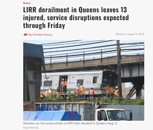 報道稱,當?shù)毓賳T介紹,這列隸屬于長島鐵路公司的火車從紐約市中央車站出發(fā),在行至皇后區(qū)牙買加車站附近時發(fā)生事故,所掛八節(jié)車廂全部脫軌。