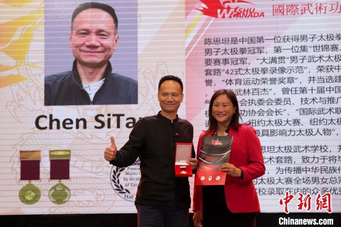 8月7日,加拿大聯(lián)邦眾議員葉嘉麗(右)向來自中國的太極名家陳思坦頒授國際武術(shù)功夫名人堂勛章。 中新社記者 余瑞冬 攝