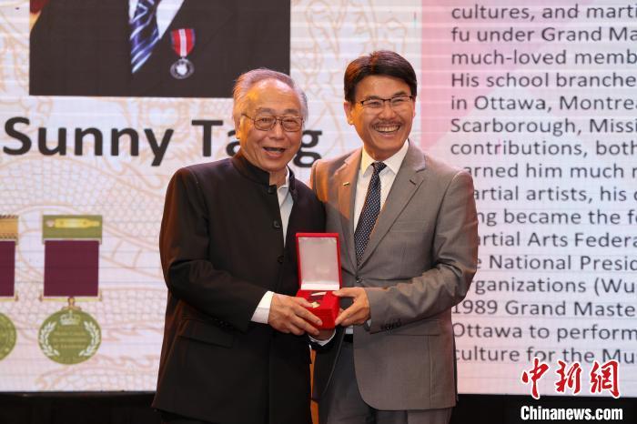 7日,國際武術(shù)聯(lián)合會執(zhí)行委員、加拿大武術(shù)團體聯(lián)合總會會長鄧華(左)獲頒國際武術(shù)功夫名人堂勛章。中新社記者 余瑞冬 攝