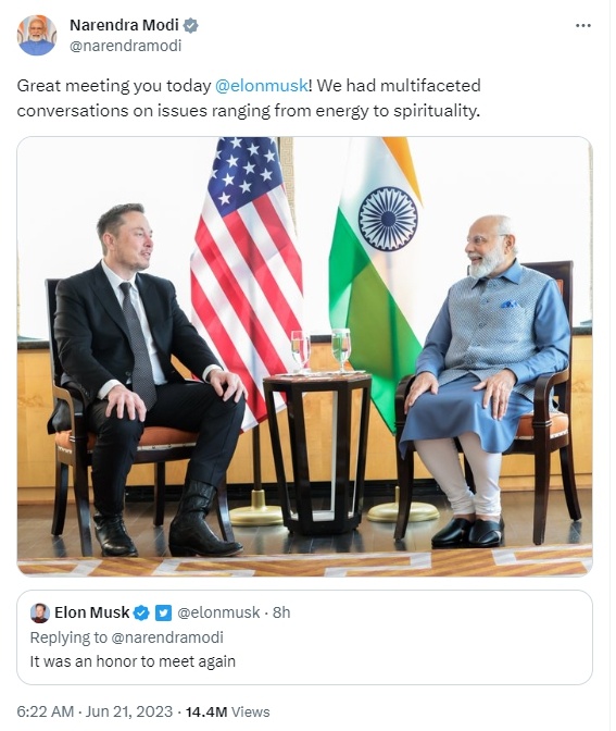莫迪在推特上談及與馬斯克的會面