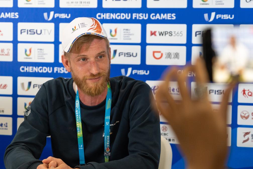 這是8月6日拍攝的萊茵-魯爾2025世界大學(xué)生夏季運(yùn)動會首席新聞宣傳官馬庫斯·柯尼希在接受媒體采訪。 新華社記者 龍泠宇 攝