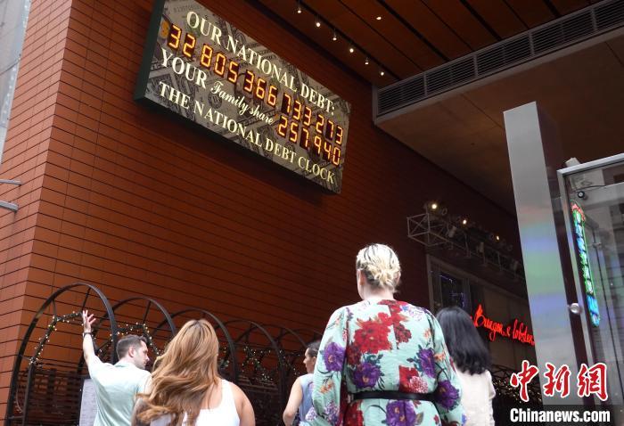 當(dāng)?shù)貢r(shí)間8月15日,行人經(jīng)過美國(guó)紐約的“國(guó)債鐘”?!≈行律缬浾?王帆 攝