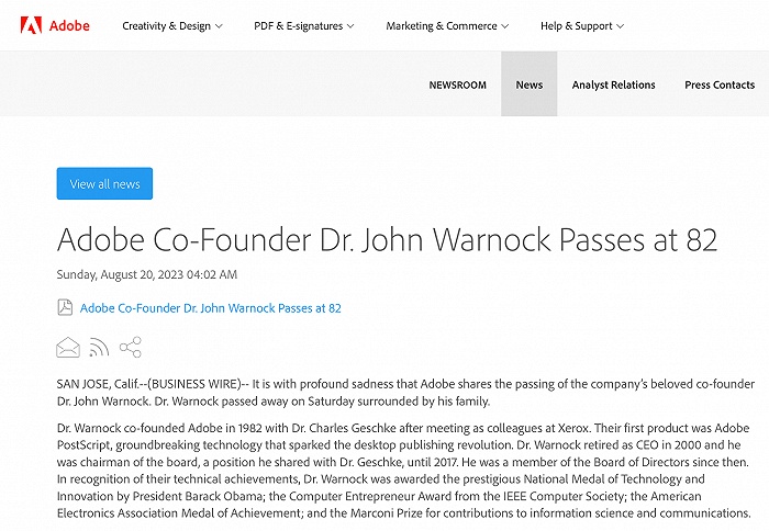 8月20日,據(jù)Adobe官網(wǎng)消息,Adobe聯(lián)合創(chuàng)始人約翰·沃諾克(John Warnock)于周六去世,享年82歲。