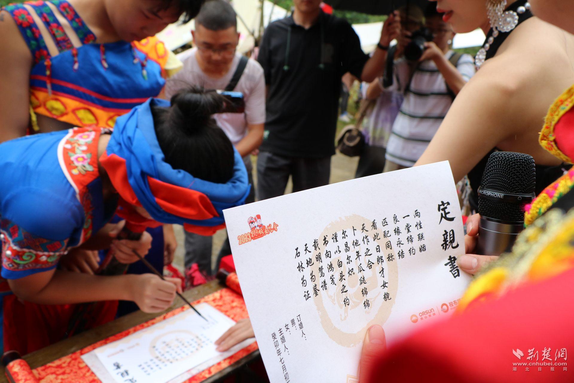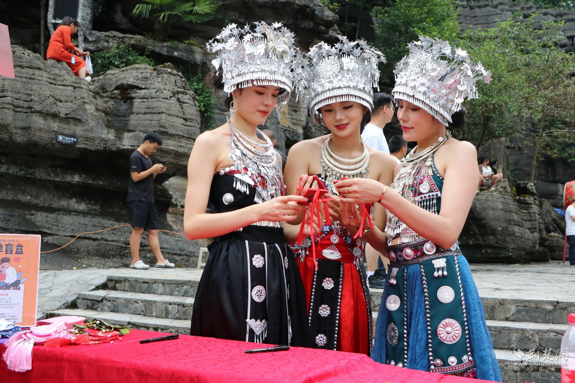 現(xiàn)場單身男女通過石林自由相親、集體相親等互動環(huán)節(jié),成功牽手12對并在儺婆石前簽下了定情書。女兒會自由相親及情歌互動活動將持續(xù)至8月23日,以文化牽引力量,助力恩施大旅游發(fā)展。