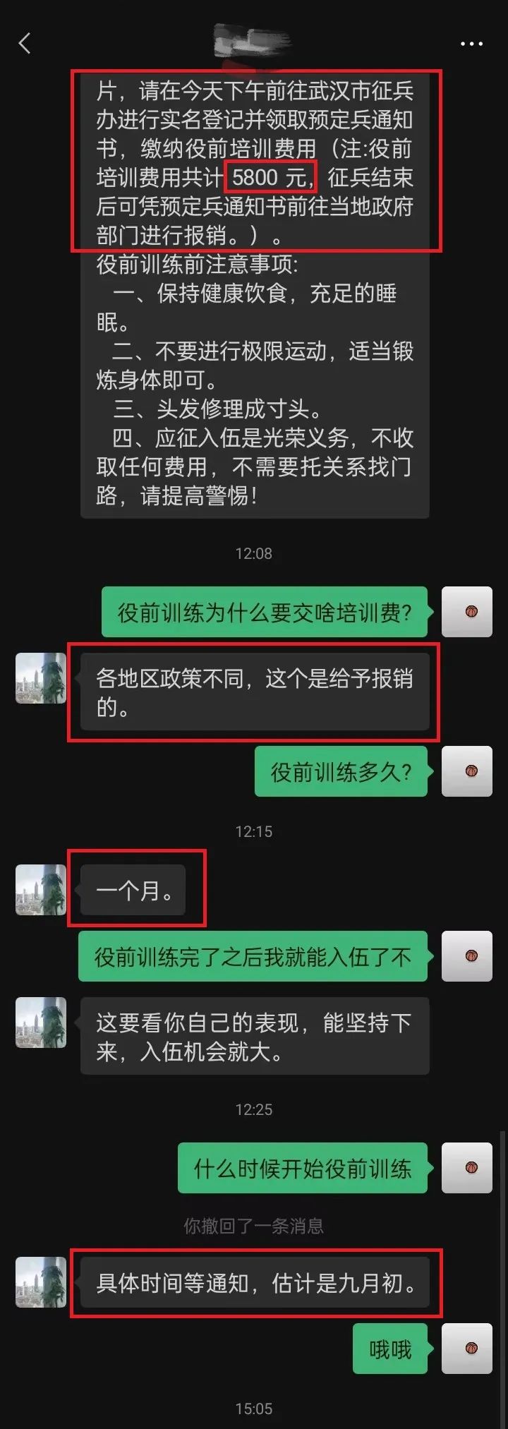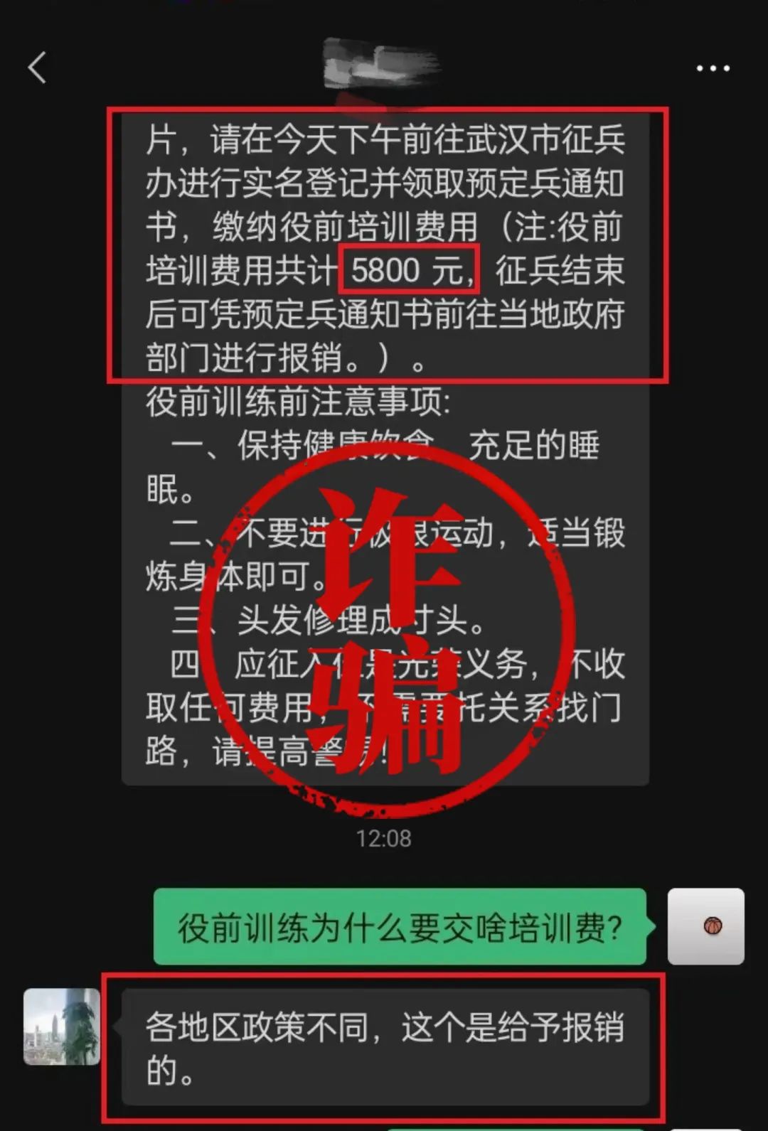 騙子聲稱(chēng)“繳納役前培訓(xùn)費(fèi)用”,還說(shuō)可憑預(yù)定兵通知書(shū)進(jìn)行報(bào)銷(xiāo),甚至提醒應(yīng)征青年役前教育的相關(guān)注意事項(xiàng)。話(huà)術(shù)編造得看似完整,但是再三強(qiáng)調(diào)“參軍不花一分錢(qián)”,役前教育怎么可能需要繳費(fèi)呢?