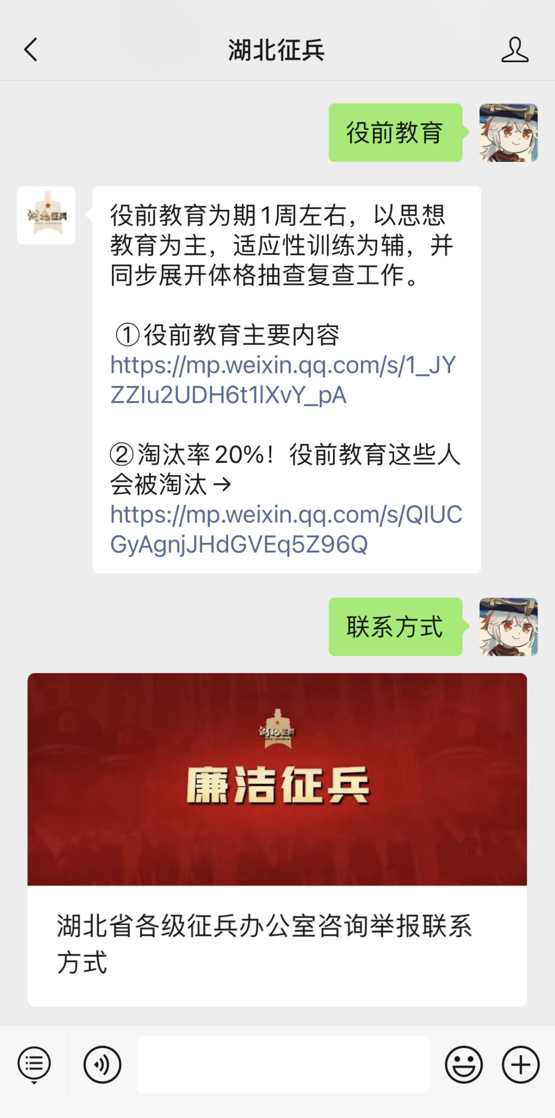 “湖北征兵”微信公眾號(hào),是湖北省人民政府征兵辦公室唯一官方認(rèn)證賬號(hào)。后臺(tái)設(shè)置“自動(dòng)回復(fù)”功能,大家可以在后臺(tái)輸入“聯(lián)系方式”“役前教育”等關(guān)鍵詞匯,獲取相關(guān)信息:
