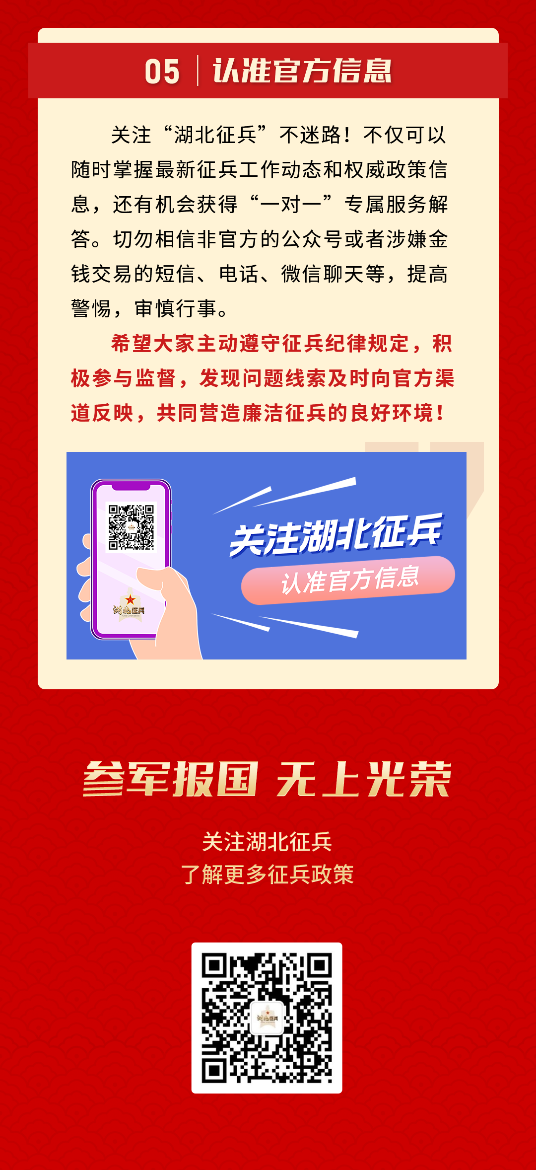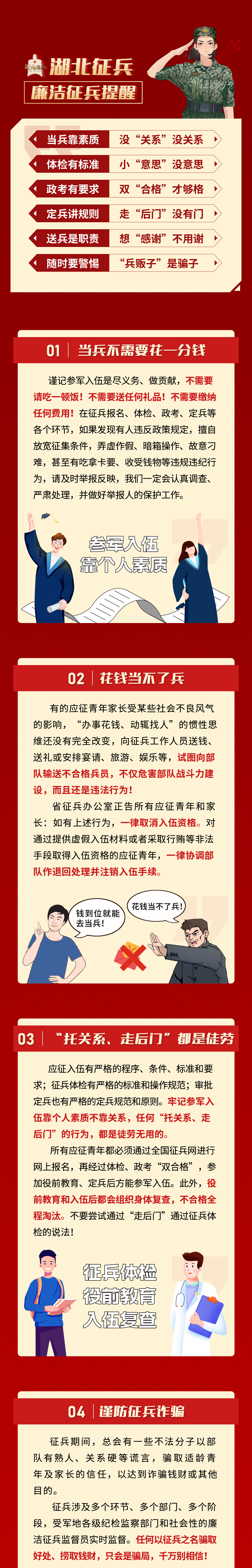 每年征兵季,總有不法分子利用部分青年參軍心切以及對(duì)征兵政策、流程不了解等弱點(diǎn),花言巧語(yǔ)騙取錢(qián)財(cái)。應(yīng)征入伍的過(guò)程中,一定要認(rèn)準(zhǔn)官方權(quán)威渠道。