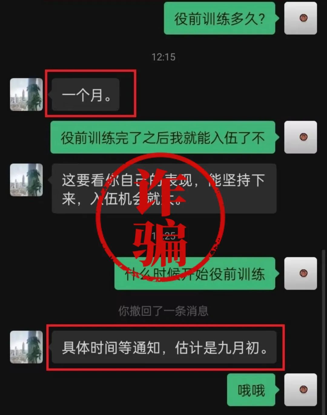 每年征兵工作的各個(gè)階段,總有“不法分子”借機(jī)行騙,近日就出現(xiàn)了這樣一則以各地準(zhǔn)備役前教育工作為契機(jī),聲稱(chēng)“繳納役前教育培訓(xùn)費(fèi)用”進(jìn)行征兵詐騙。