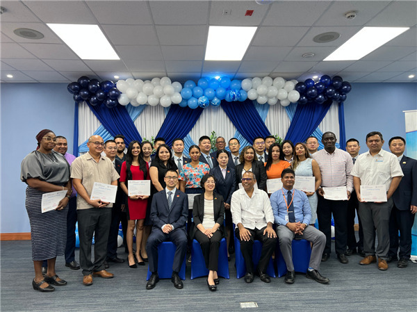 安東尼、郭海燕與醫(yī)療隊員以及學(xué)員代表合影。第18期中國援圭亞那醫(yī)療隊供圖