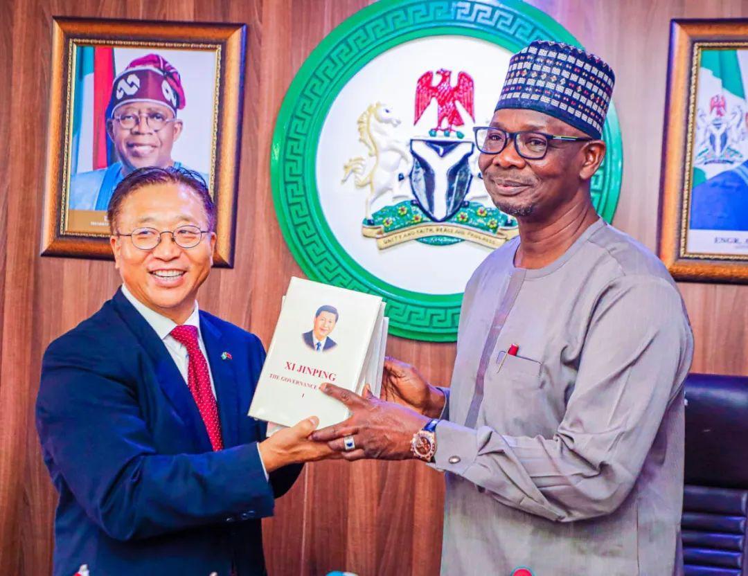 駐尼日利亞大使崔建春(左)向納薩拉瓦州州長蘇勒贈(zèng)送《習(xí)近平談治國理政》系列書籍。駐尼日利亞使館供圖
