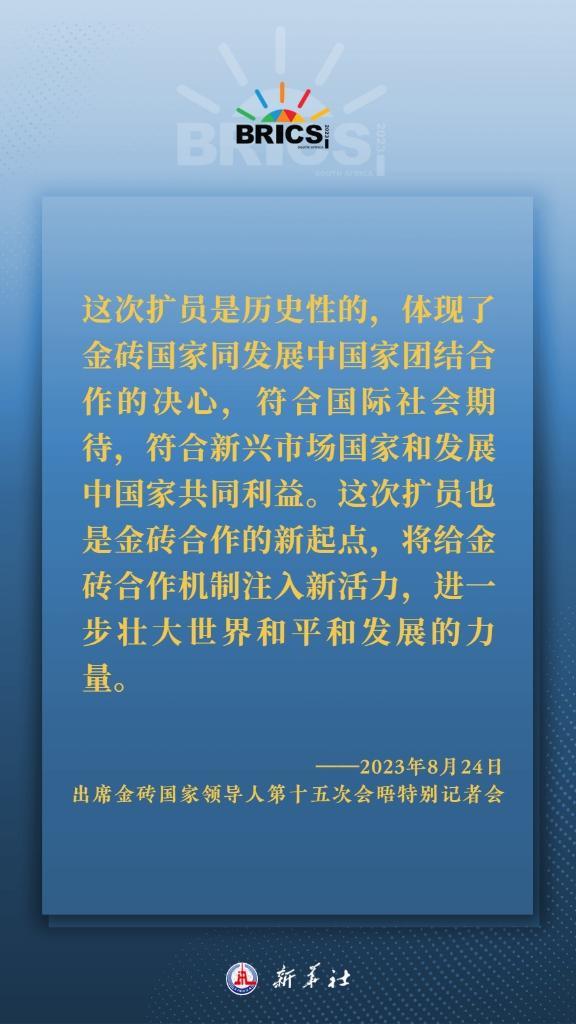 8月22日至24日,金磚國家領(lǐng)導(dǎo)人第十五次會晤在南非約翰內(nèi)斯堡舉行,習(xí)近平主席出席。在會晤中,習(xí)近平主席同其他金磚國家領(lǐng)導(dǎo)人一致同意,邀請沙特、埃及、阿聯(lián)酋、阿根廷、伊朗、埃塞俄比亞成為金磚大家庭成員。