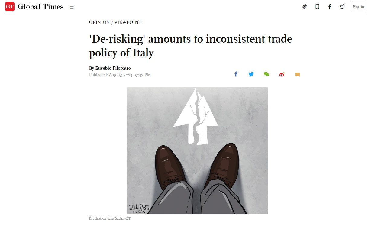 8月初,《環(huán)球時(shí)報(bào)》英文版刊發(fā)署名為尤西比奧的意大利學(xué)者的文章《“去風(fēng)險(xiǎn)”導(dǎo)致意大利貿(mào)易政策前后不一》。圖為文章網(wǎng)絡(luò)版截圖。