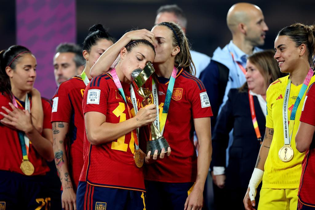 8月20日,西班牙隊球員珍妮弗·埃爾莫索(前左)與隊友在頒獎儀式上親吻冠軍獎杯。新華社記者丁旭攝