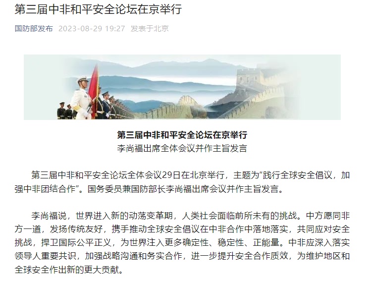 第三屆中非和平安全論壇于8月28日至9月2日舉行,是新冠疫情之后首次在線下舉行,來自非盟和近50個(gè)非洲國(guó)家的百余位高級(jí)代表出席本屆論壇。此次論壇主題為“踐行全球安全倡議,加強(qiáng)中非團(tuán)結(jié)合作”,旨在進(jìn)一步加強(qiáng)中非防務(wù)部門戰(zhàn)略溝通,為構(gòu)建新時(shí)代中非命運(yùn)共同體發(fā)揮積極作用。