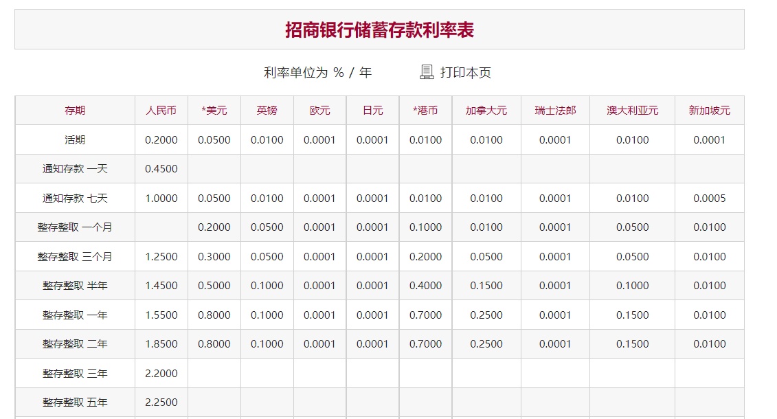 股份行中,整存整取1年期下調10個基點,2年期下調20個基點,3年期、5年期下調25個基點。具體來看,招商銀行整存整取1年期利率下調10個基點至1.55%,2年期利率下調20個基點至1.85%,3年期、5年期利率下調25個基點至2.2%、2.25%。
