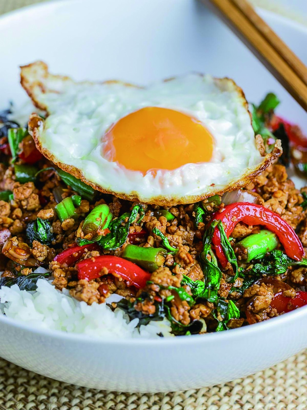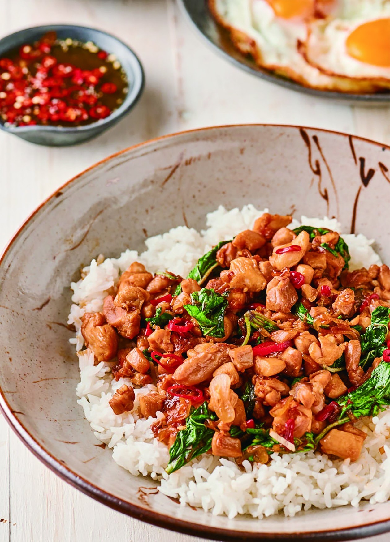 從藥膳的角度來看,泰式打拋飯所用的食材主要有以下這些“藥效”:雞肉、雞蛋可以讓人充滿元氣,減輕疲倦感,同時有補水、補血的效果。青椒、洋蔥、大蒜、羅勒則具有補氣、促進血液循環(huán)的作用。