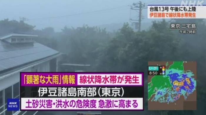 當(dāng)?shù)貢r間8日早上,受臺風(fēng)“鴛鴦”影響,日本東京三宅島出現(xiàn)暴雨天氣。圖片來源:日本放送協(xié)會(NHK)報道截圖