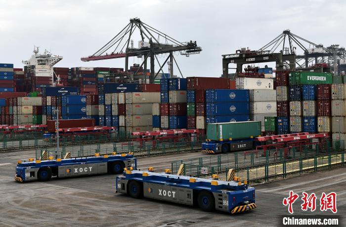 9月7日,廈門遠海自動化碼頭上,轉(zhuǎn)運集裝箱的自動導(dǎo)引車正在作業(yè)。這是全球首個第四代自動化碼頭、中國首個擁有全部自主知識產(chǎn)權(quán)的自動化碼頭,開行了多條“絲路海運”命名航線。 中新社記者 張斌 攝