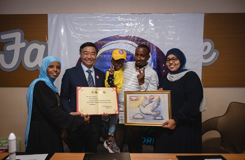 中國駐索馬里大使費勝潮向卡伍基卜頒發(fā)了一等獎獲獎證書。費勝潮說,索馬里兒童的畫作不僅獲得了繪畫比賽一等獎,還在太空中展出,這不僅僅是索馬里的驕傲,也是中索關(guān)系、中非關(guān)系的驕傲。他勉勵索馬里青少年認(rèn)真學(xué)習(xí),堅持夢想,為和平發(fā)展貢獻(xiàn)力量。