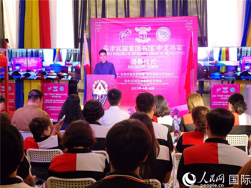 圖為菲律賓國(guó)家圖書(shū)館“中文書(shū)架”揭幕儀式。人民網(wǎng)記者 樊 帆攝