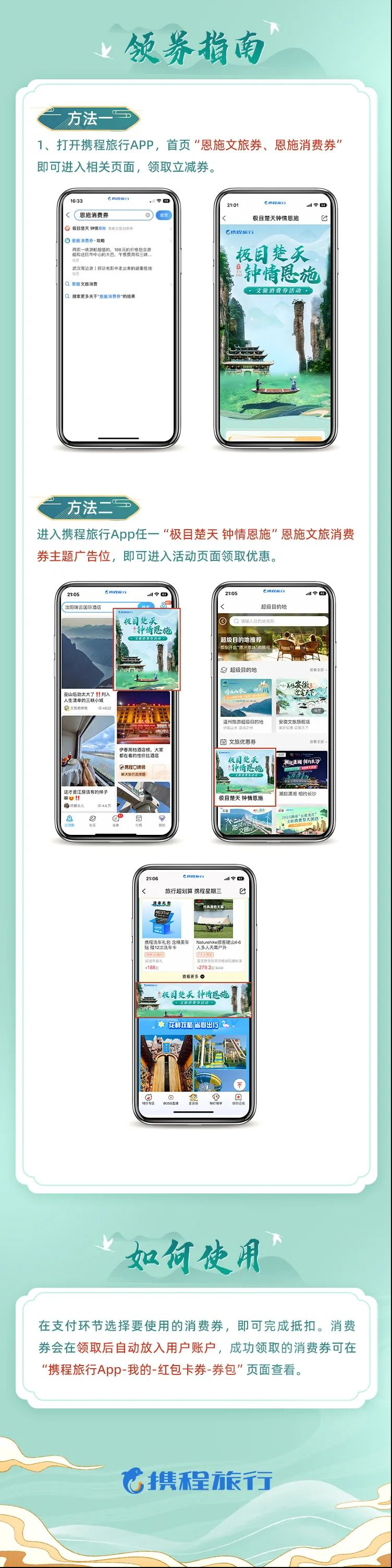 方法二:進(jìn)入攜程旅行App任一“極目楚天 鐘情恩施”恩施文旅消費券主題廣告位,即可進(jìn)入活動頁面領(lǐng)取消費券。