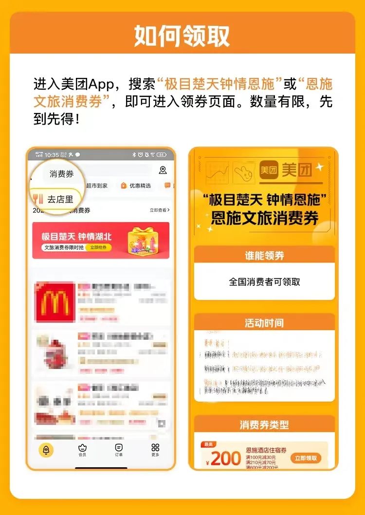 在美團(tuán)和大眾點評App搜索“恩施文旅消費券”“恩施消費券”等關(guān)鍵詞,進(jìn)入活動頁面領(lǐng)券。已領(lǐng)取的消費券可在“美團(tuán)App-我的-紅包卡券-券包”或“大眾點評App-我的-錢包-現(xiàn)金券”內(nèi)查看,活動期間,消費券數(shù)量有限,領(lǐng)完即止。