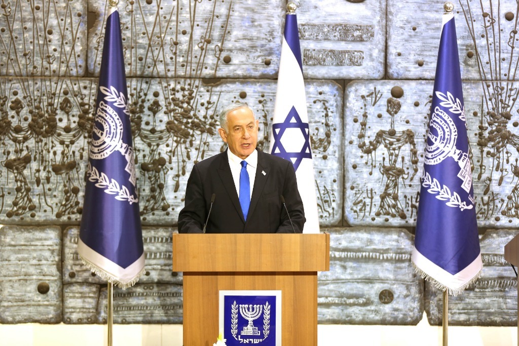 2022年11月13日,內(nèi)塔尼亞胡在以色列總統(tǒng)府舉行的組建新政府授權(quán)儀式上發(fā)表講話。新華社記者王卓倫攝