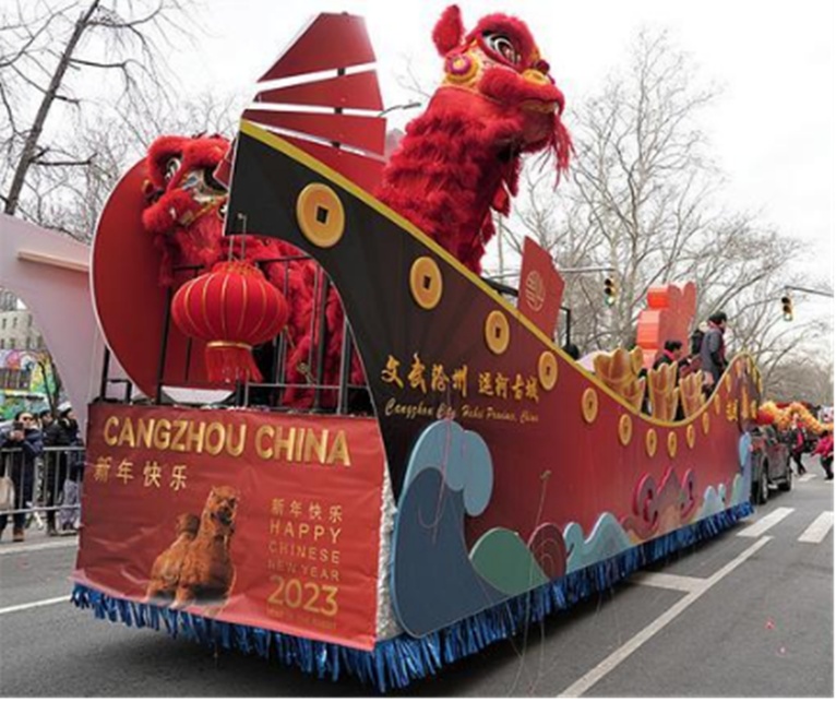 在紐約新春愛心花車大游行文化節(jié)上,“文武滄州,運(yùn)河古城”主題花車上演了一出“文化出?!钡暮脩?。滄州花車整體呈古船造型,船上還有舞獅表演。滄州立體造型花車被主辦方專門安排為頭車引領(lǐng)整個(gè)花車游行隊(duì)伍,在梅花、燈籠等傳統(tǒng)元素的加持下,呈現(xiàn)出一場(chǎng)動(dòng)人心弦的東方文化視覺盛宴,引得海外觀眾頻頻喝彩并按下快門,最終奪得本屆文化節(jié)“最美花車”稱號(hào)。