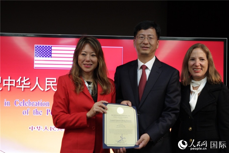 | 駐舊金山總領事張建敏(中)和加州副州長康依蓮(右)、財務長馬世云(左)在國慶招待會上。人民網(wǎng)記者 鄧圩攝 |