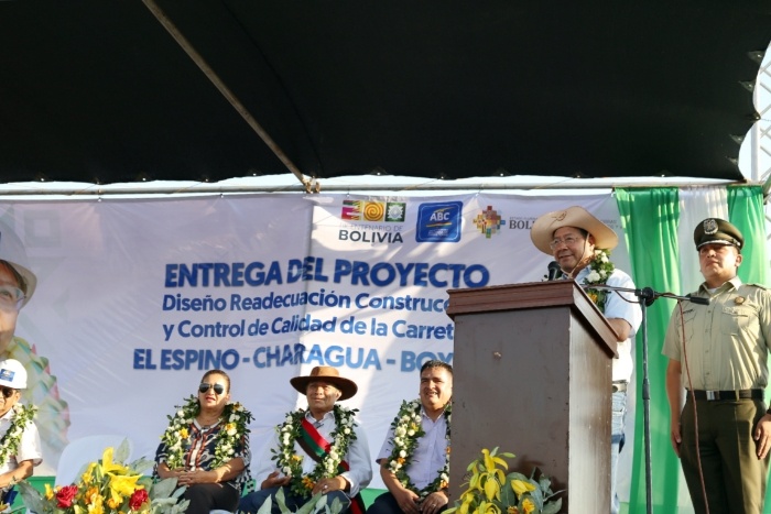 玻利維亞總統(tǒng)阿爾塞在埃爾埃斯皮諾公路項(xiàng)目竣工通車儀式上致辭。中國(guó)中鐵供圖