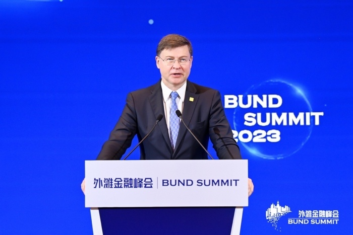| 歐盟委員會(huì)執(zhí)行副主席東布羅夫斯基斯在第五屆外灘金融峰會(huì)上發(fā)表主題演講。外灘金融峰會(huì)組委會(huì)供圖 |