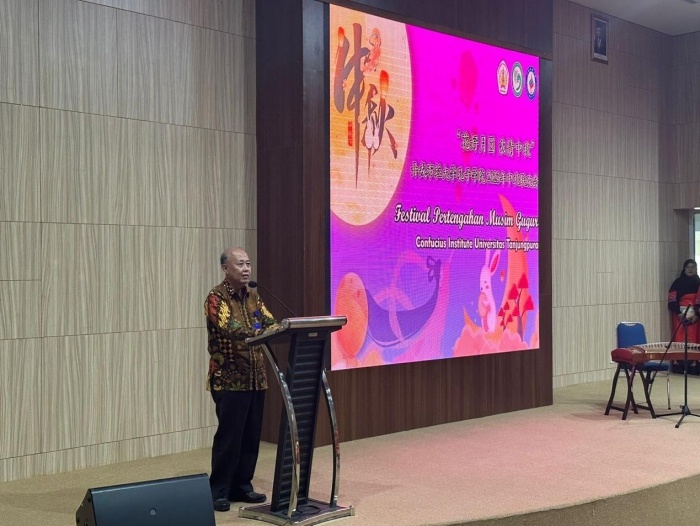| 印尼丹戎布拉大學(xué)孔子學(xué)院中方院長周桂致辭。丹戎布拉大學(xué)供圖 |