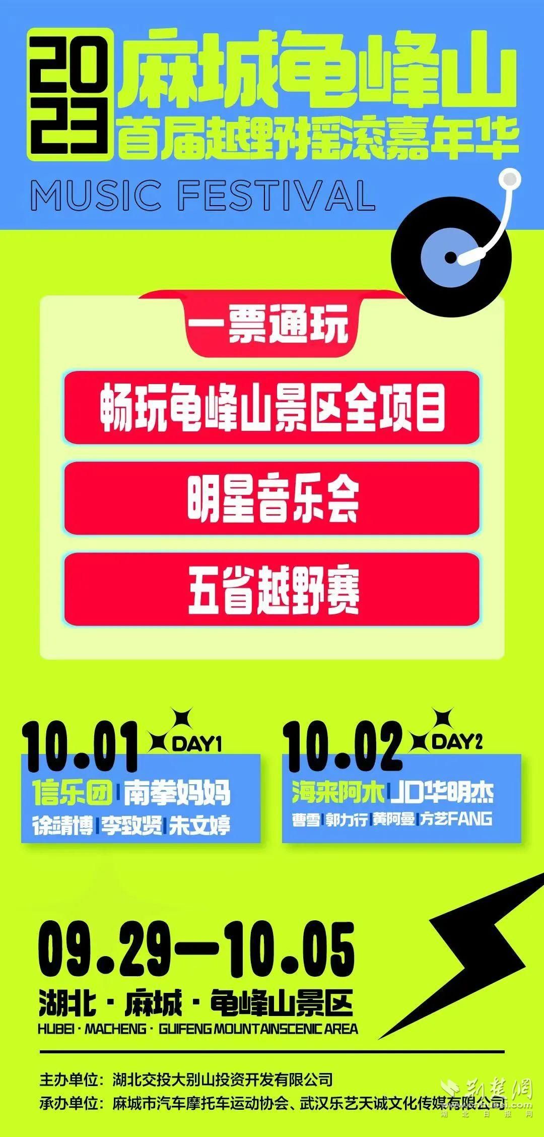 2023麻城龜峰山首屆越野搖滾嘉年華是景區(qū)首次舉行的集“場(chǎng)地越野車挑戰(zhàn)賽”、“明星搖滾音樂(lè)會(huì)”與“龜峰山景區(qū)內(nèi)所有配套”于一體的大型歡樂(lè)嘉年華活動(dòng)。