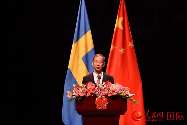 中國駐瑞典大使館崔愛民在國慶招待會上致辭。人民網(wǎng)記者 殷淼攝