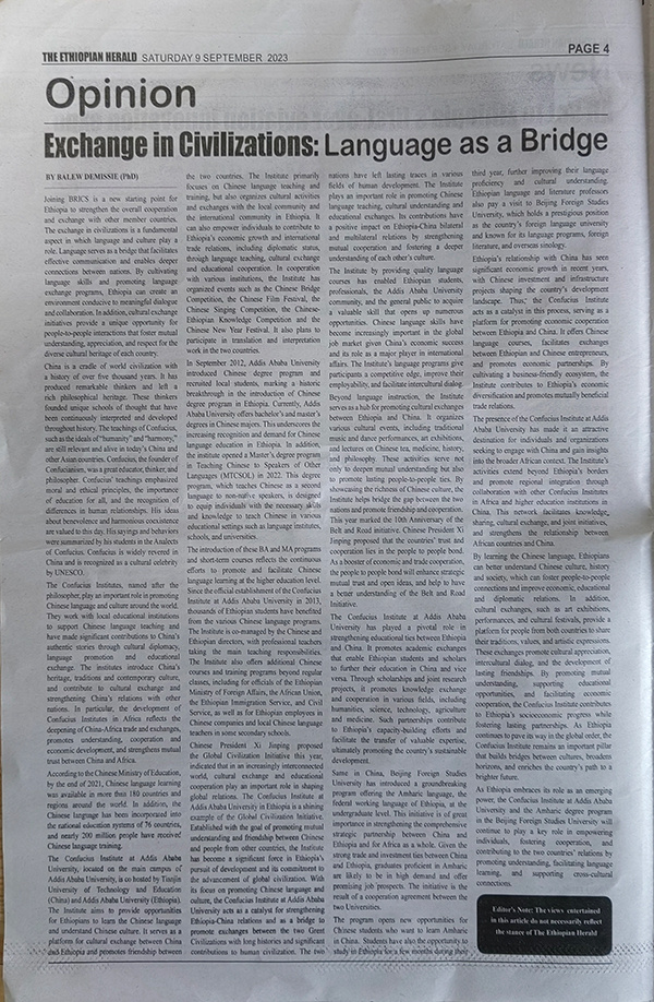 人民網開羅9月25日電 (記者沈小曉)近日,埃塞俄比亞政策研究院研究員、亞的斯亞貝巴大學副教授巴盧·德米西在埃塞官方第一大報《埃塞先驅報》上撰文,以《文明交流:語言為橋》為題發(fā)表整版文章。文章提到,“加入金磚國家大家庭是埃塞俄比亞加強與其他成員國全面合作與交流的新起點。文明間的交流是基礎,語言和文化在其中起著重要作用。語言是促進國與國之間有效溝通、加強聯(lián)系的橋梁?!?/p>