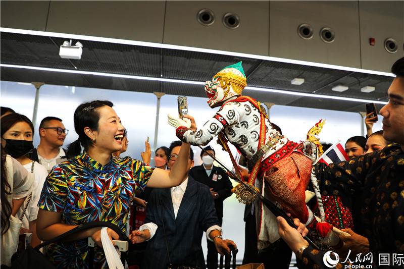 在迎接儀式中,泰國(guó)機(jī)場(chǎng)工作人員與中國(guó)游客友好互動(dòng)。人民網(wǎng)記者 白元琪攝