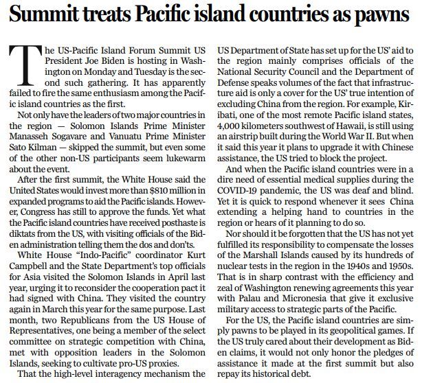 歸根結(jié)底,對美國而言,太平洋島國不過是其地緣政治博弈中的棋子。若美國真的想要促進(jìn)該地區(qū)的發(fā)展,那么它不僅會兌現(xiàn)首屆峰會上作出的援助承諾,也會償還歷史債務(wù)。