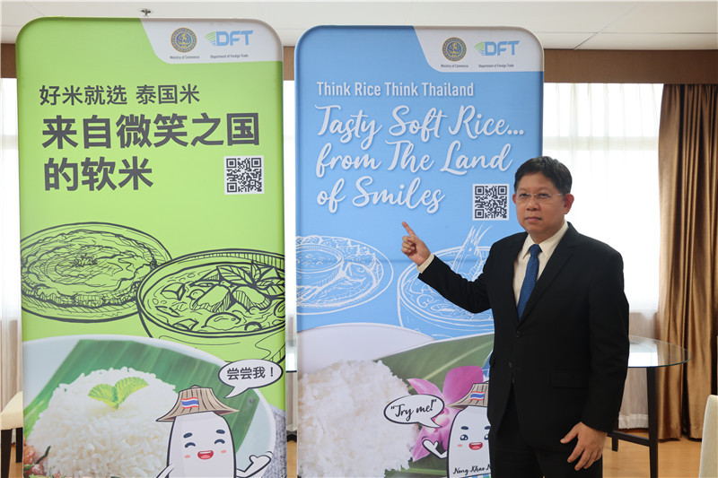 圖為泰國(guó)商務(wù)部國(guó)際貿(mào)易廳廳長(zhǎng)倫納隆推介軟質(zhì)白米。泰國(guó)商務(wù)部供圖