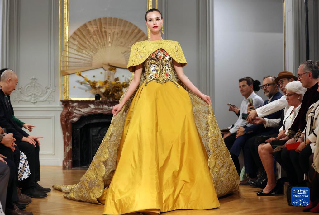 9月27日,模特在法國巴黎中國文化中心舉辦的“恭王府服飾秀”上展示設(shè)計師勞倫斯·許創(chuàng)作的恭王府系列高定服裝。新華社記者 高靜 攝