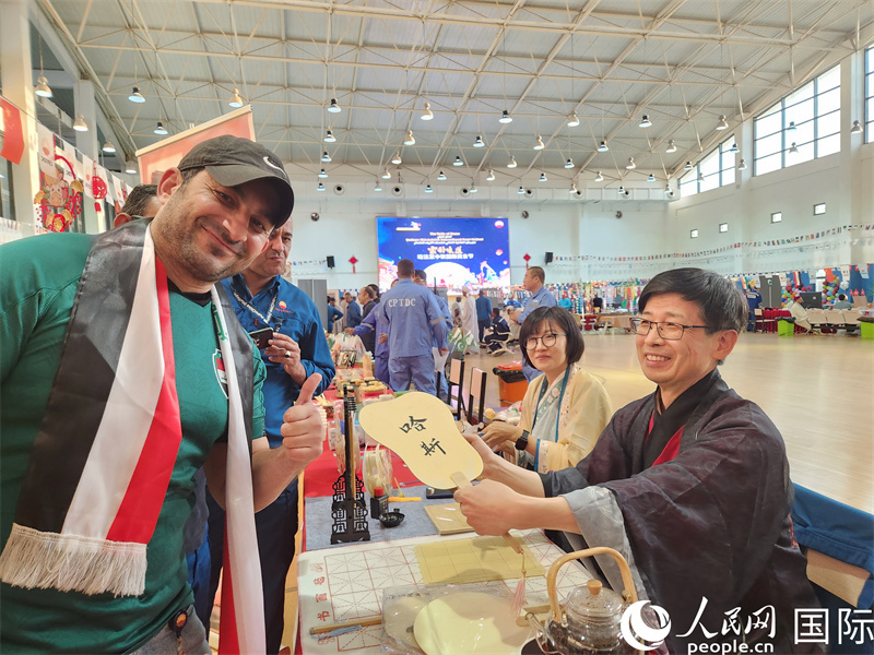 一名伊拉克員工高興地接過(guò)一把寫(xiě)有自己中文名字的扇子。 人民網(wǎng)記者 管克江攝