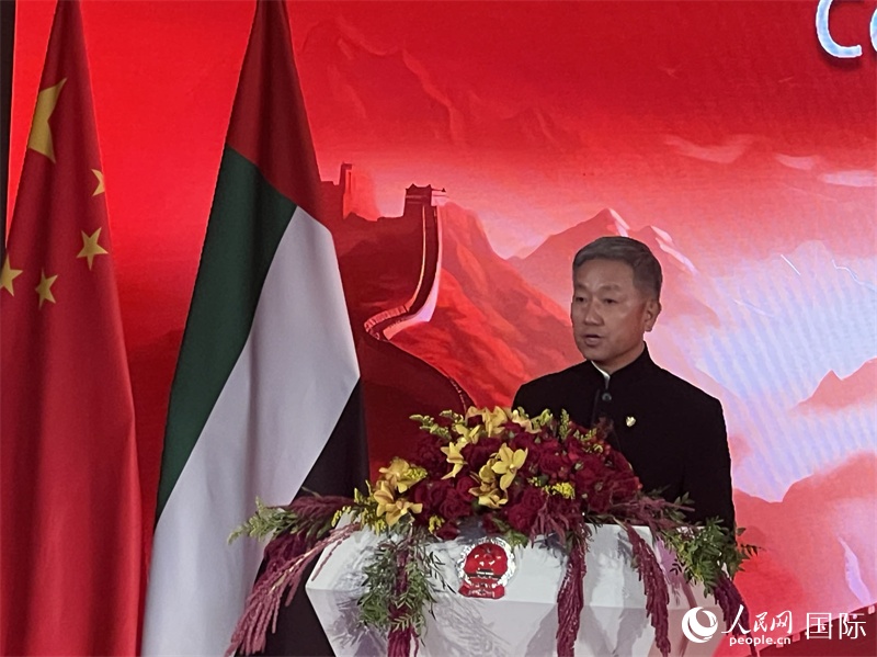| 中國駐阿聯(lián)酋大使張益明在招待會上致辭。人民網(wǎng)記者 張志文攝 |