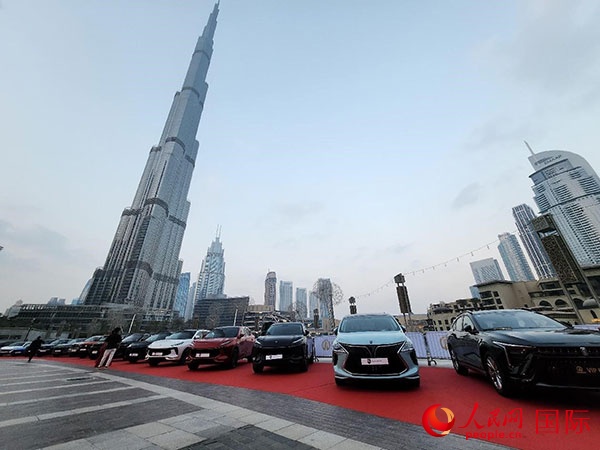 圖為在迪拜哈利法塔公園展示的中國品牌汽車。人民網(wǎng)記者 管克江攝