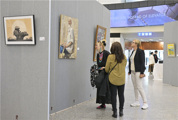| 各國(guó)外交官在在欣賞中國(guó)藝術(shù)家作品。中國(guó)常駐維也納代表團(tuán)供圖 |