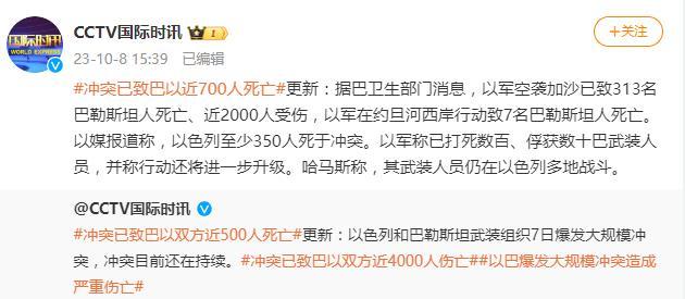 央視網(wǎng)消息:據(jù)CCTV國(guó)際時(shí)訊微博消息,據(jù)巴衛(wèi)生部門(mén)消息,以軍空襲加沙已致313名巴勒斯坦人死亡、近2000人受傷,以軍在約旦河西岸行動(dòng)致7名巴勒斯坦人死亡。以媒報(bào)道稱(chēng),以色列至少350人死于沖突。以軍稱(chēng)已打死數(shù)百、俘獲數(shù)十巴武裝人員,并稱(chēng)行動(dòng)還將進(jìn)一步升級(jí)。哈馬斯稱(chēng),其武裝人員仍在以色列多地戰(zhàn)斗。